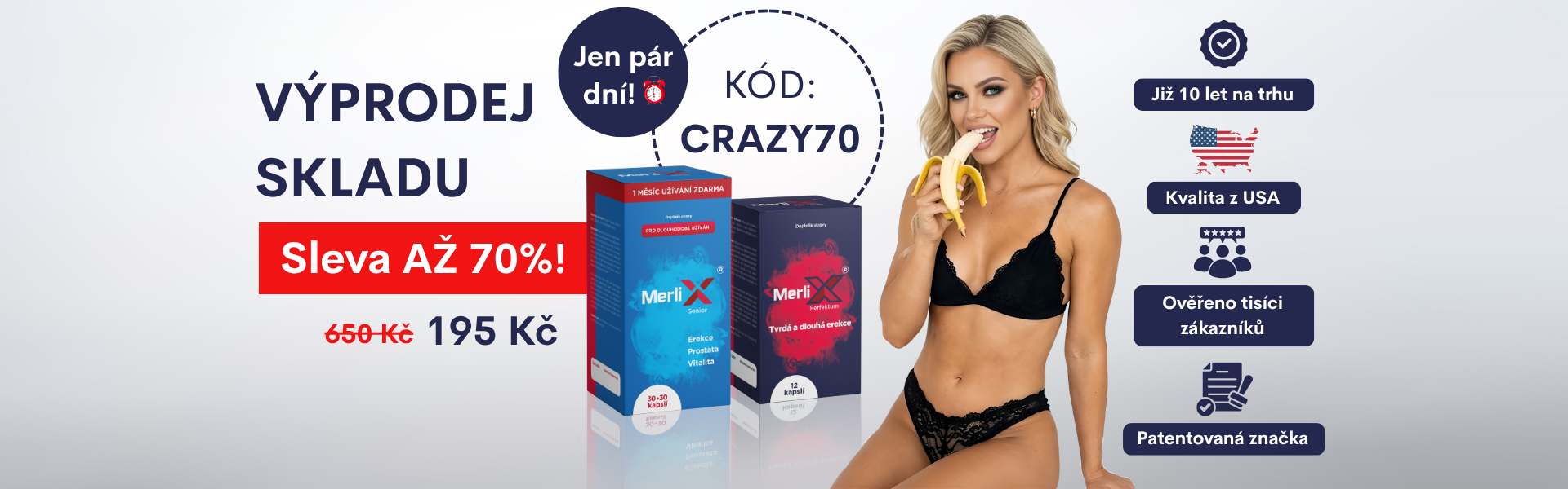 Tento produkt z USA, který je dlouhá léta úspěšně používán na podporu erekce a zlepšení sexuálního zdraví, je konečně dostupný už i v České republice. Problémy s erekcí trápí velké množství mužů. Pokud i vy patříte mezi ně, sáhněte po výživovém doplňku MerliX. Stačí užít jednu tabletku MerliX Perfektum pár minut před sexem a budete v posteli znovu dominantní a silný milenec. V nabídce značky najdete také variantu Senior, která je určena pro starší muže na dlouhodobé pravidelné užívání. S tabletkami MerliX Senior dosáhnete celkového zlepšení sexuálního zdraví a výkonnosti již za pár týdnů užívání doplňku.